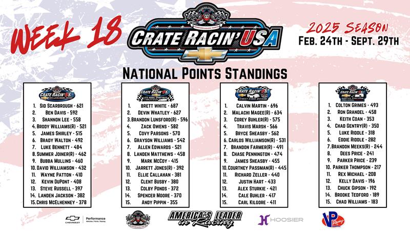 (Eastaboga, AL - July 2, 2025) – As the Crate Racin’ USA National Weekly Championship chase rolls into the final stretch, Week 18 brought a mix of consistency at the top and chaos in the chase packs. With just 12 weeks remaining, every race—and every point—matters more than ever.