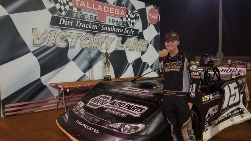 PHOTO CUTLINE: A VP Racing Fuels Young Guns Challenge Series driver, 14-year-old Lane Shuler of Ohatchee, AL, drove to his first Newsome Raceway Parts Crate Racin’ USA Weekly Racing Series Late Model win of the season on Saturday night at Talladega Short Track in Eastaboga, AL driving the #15 NAPA Auto Parts Special. (TST Photo)
